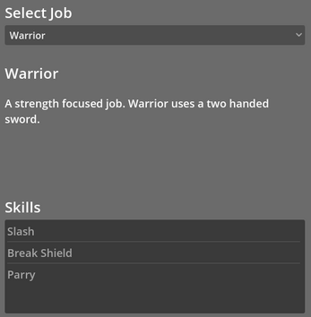Simple job selector for an RPG game that allows players to choose different character jobs from a dropdown menu. Each job is populated from a CSV file containing details like job ID, name, description, and skills. Upon selecting a job, the prototype dynamically updates the description displayed below the dropdown, giving the player a brief overview of the chosen job.